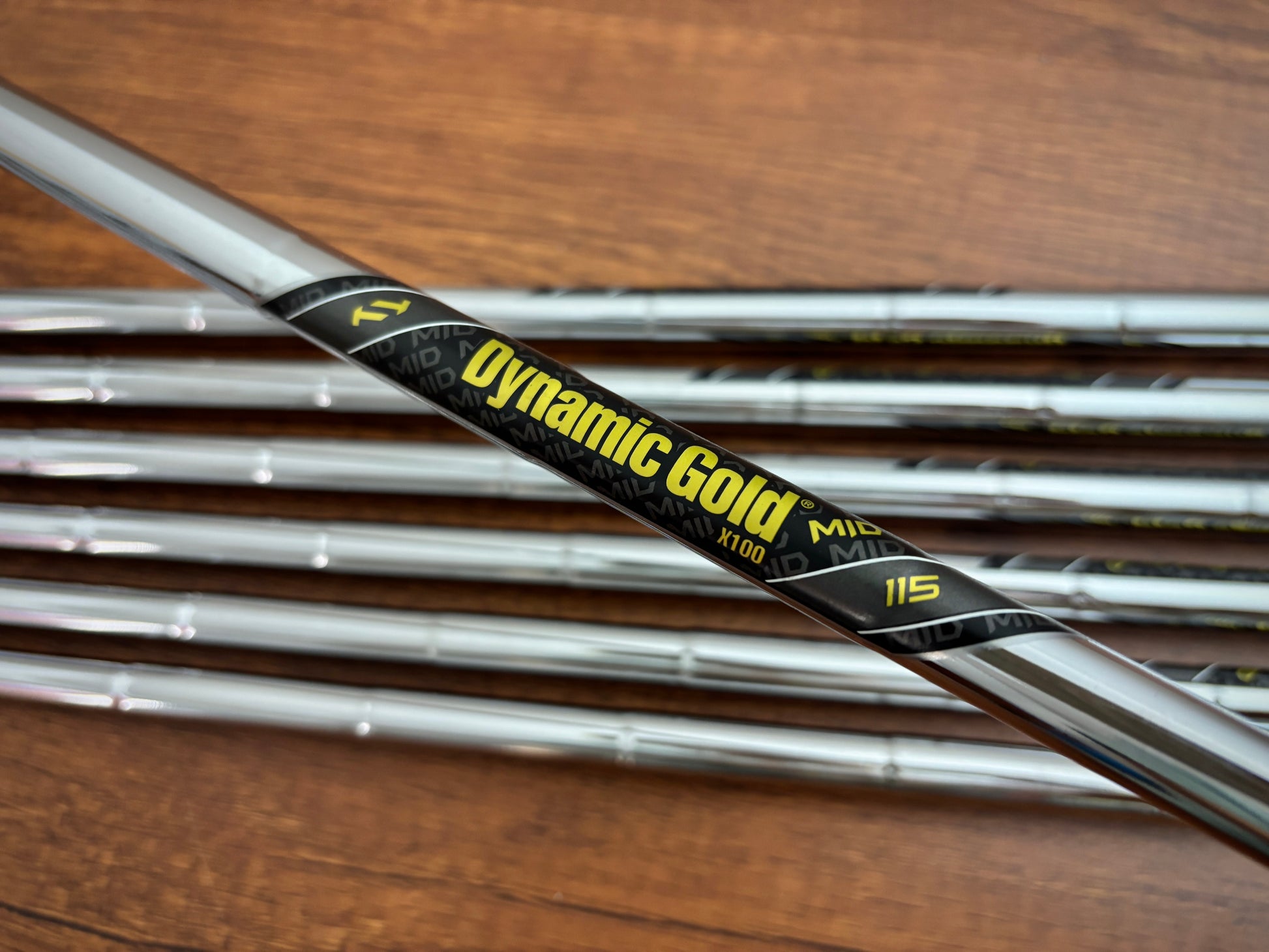 Dynamic Gold X100 x-stiff steel shafts, and nice golf pride grips